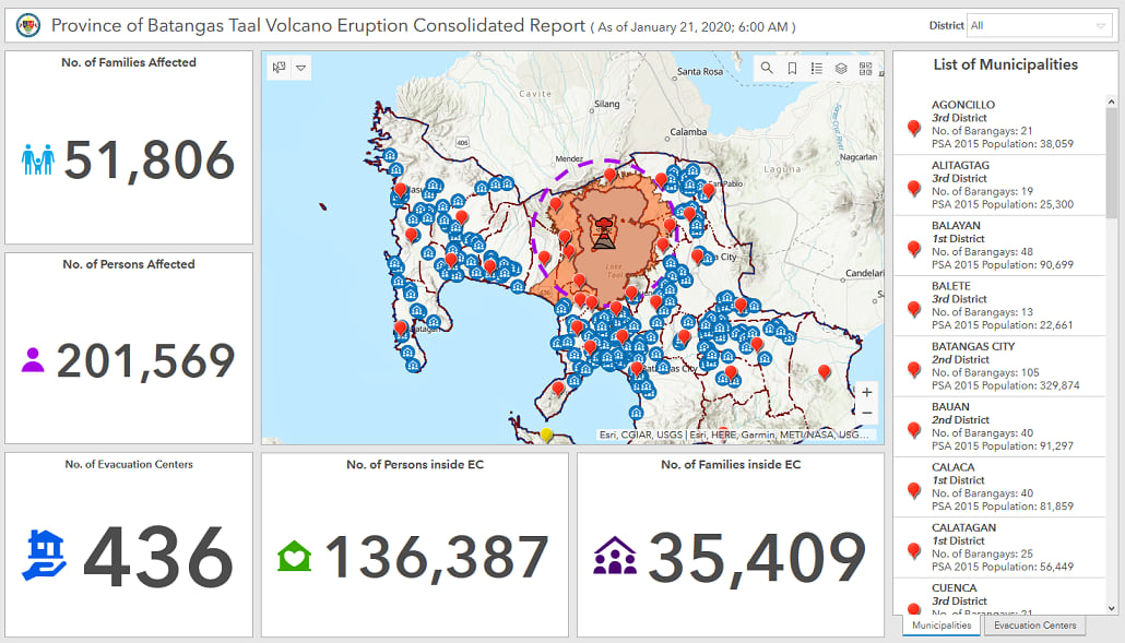In the Philippines, the Taal volcano unexpectedly erupted on Jan 12. Tens of thousands of people who lived in range of the eruption were affected. GeoData Systems, the local esri Distributor created a dashboard showing relevant statistics of affected people, available shelters, etc.