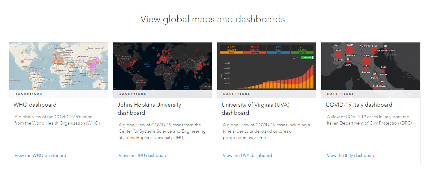 With the current COVID-19 situation across the world, there’s been a proliferation of corona virus themed dashboards emerging over the last few weeks in ArcGIS Online. Many of these were created with ArcGIS Dashboards, which enables users to convey information by presenting location-based analytics using intuitive and interactive data visualizations on a single screen. A gallery of COVID-19 dashboards can be accessed from the esri COVID-19 resources Hub.