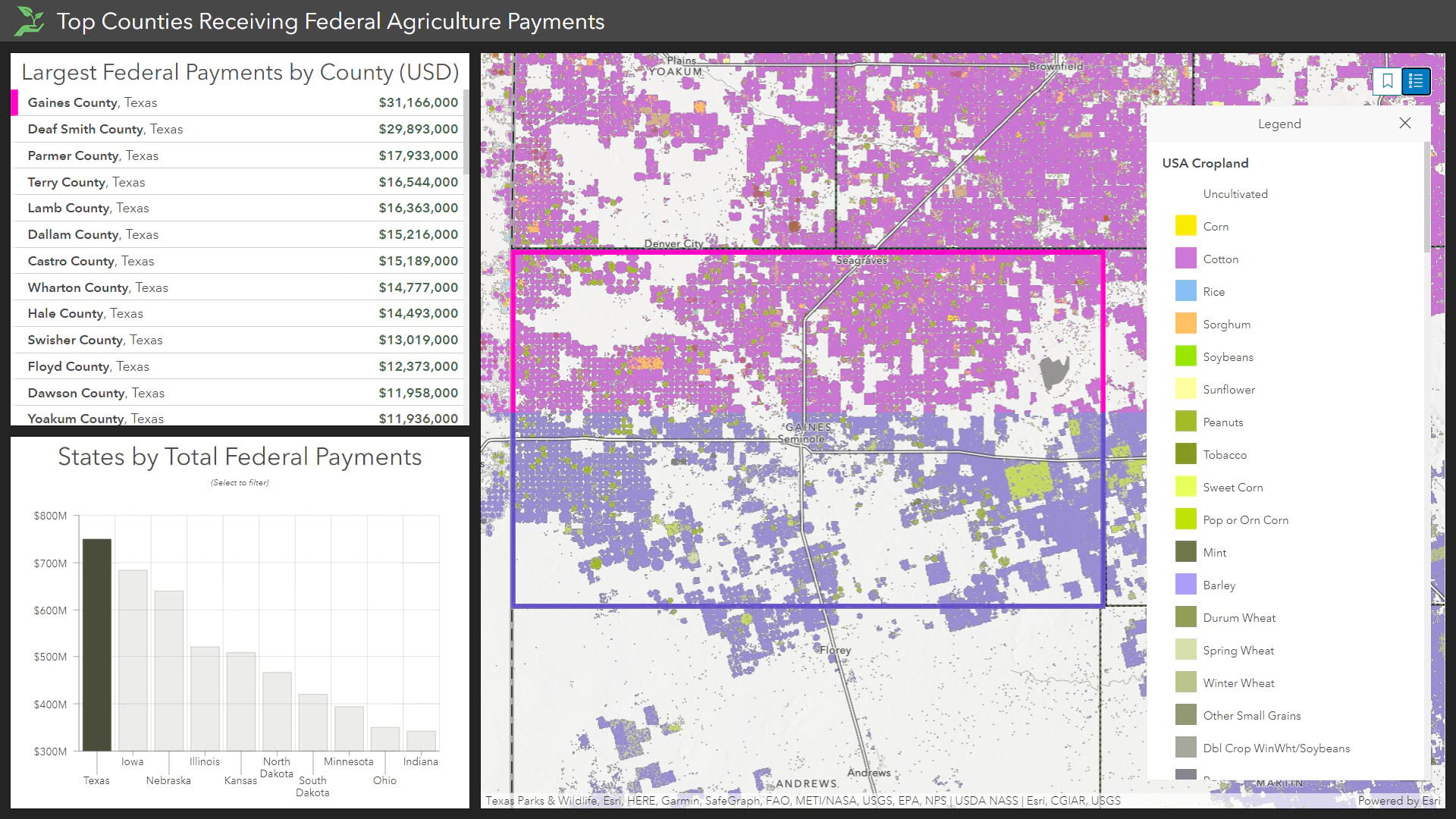 The dashboard takes a simple map showing Federal Payments – Receipts in US Dollars and displays on-the-fly statistics about the layer using chart and list widgets so we can visualize where the money is being spent. The list widget on the upper left displays the top 50 largest federal payments. Selecting a county from the list will zoom into the county on the map and display the pop-up, which contains a breakdown of federal payments toward agriculture. The map also contains USA Cropland, so when zoomed into a county, we can see what crops are grown in that area.