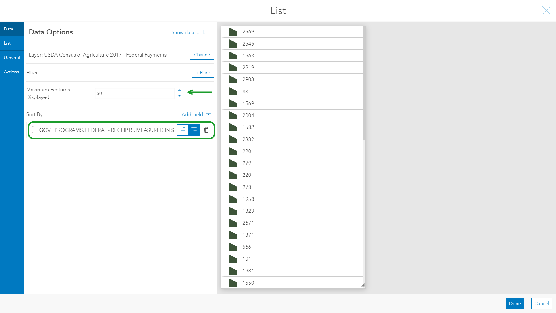 Next, let’s add the ordered list widget by selecting List from the dropdown and ‘USDA Census of Agriculture 2017 – Federal Payments’ as the layer. The list simply shows which counties have received the largest federal payments. For conciseness, the maximum features displayed is set to 50. Set the ‘Sort by’ field to GOVT PROGRAMS, FEDERAL – RECEIPTS, MEASURED IN $ in descending order.