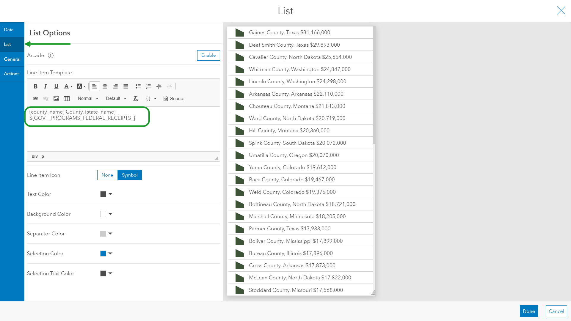 You’ll notice the list adjusts on-the-fly but does not show the actual payment amount instead defaulting to Object ID. This can be remedied by adjusting the ‘Line Item Template’ section on the List tab. Change the template to: ‘{county_name} County, {state_name} ${GOVT_PROGRAMS_FEDERAL_RECEIPTS_}‘. Now the list has meaning, and we can verify that our settings are correct.