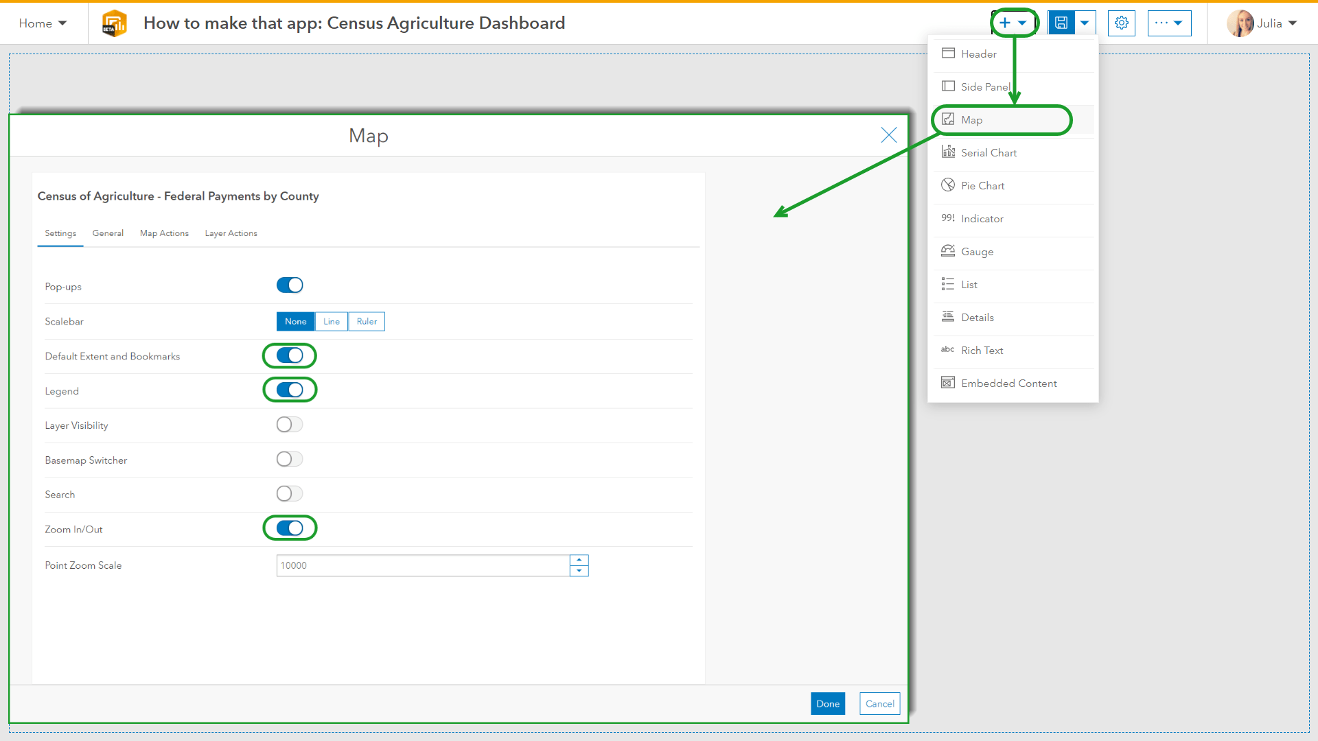 To begin, add the map widget. This provides a good starting point for the dashboard because any layers included in the map will be readily available as data sources for additional widgets. To add our Federal Payments map, select the ‘+’ then Map, and choose the map from ‘My Content’. Turn on any capabilities you want the interface to have such as legend, bookmarks, or zoom, and select ‘Done’.