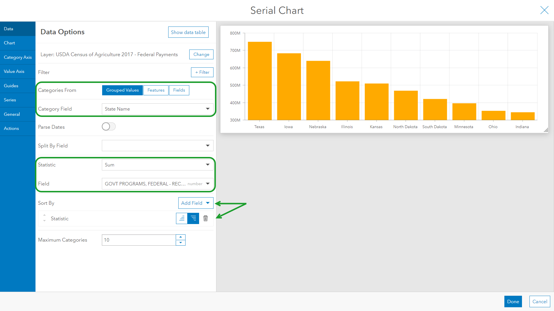 Last but not least – the serial chart. The purpose of this chart is to sum county values by their state, grouping the values together. With this theory in mind, use ‘Grouped Values’ for the ‘Category From‘ input and State_Name as the ‘Category Field’. The statistic we want to sum is again the GOVT PROGRAMS, FEDERAL – RECEIPTS, MEASURED IN $ field, third on the list. This gives us the total federal payments for each state. For clarity, I chose a maximum of 10 categories sorted in descending order by the statistic (i.e. sum) to show only the top ten states receiving the largest payments.