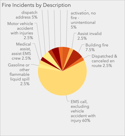 Continuing with the fire chief’s dashboard, suppose we try to visualize the relative proportions of fire incident types using a pie chart. There are many different classifications of incidents with detailed descriptions. For colors, we try using a fire-colored ramp. The following is the result: