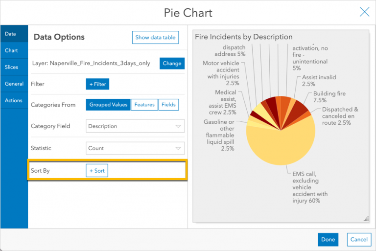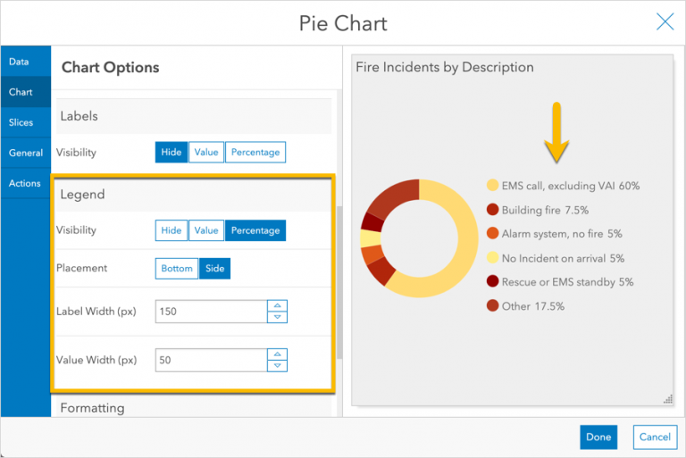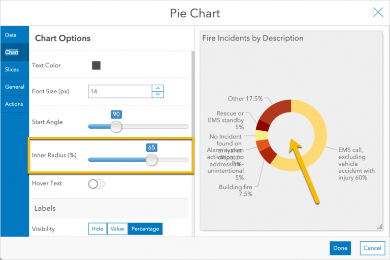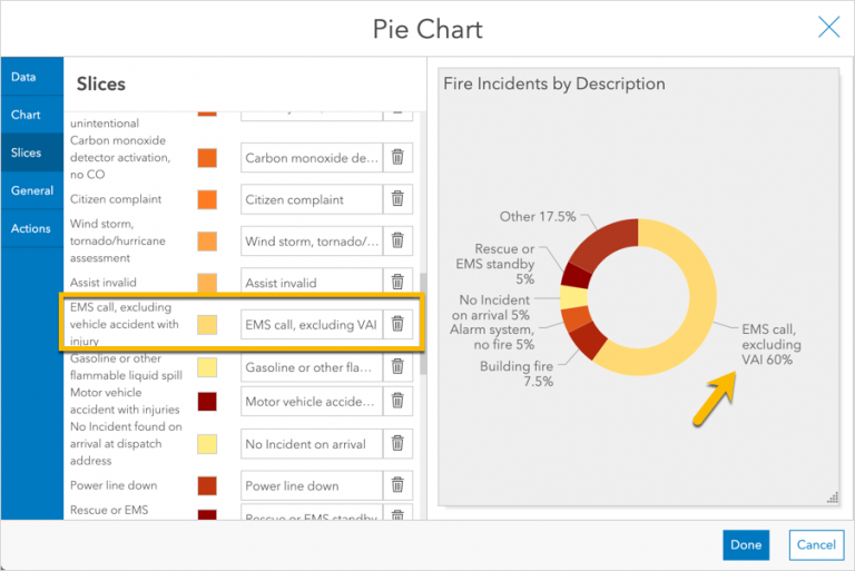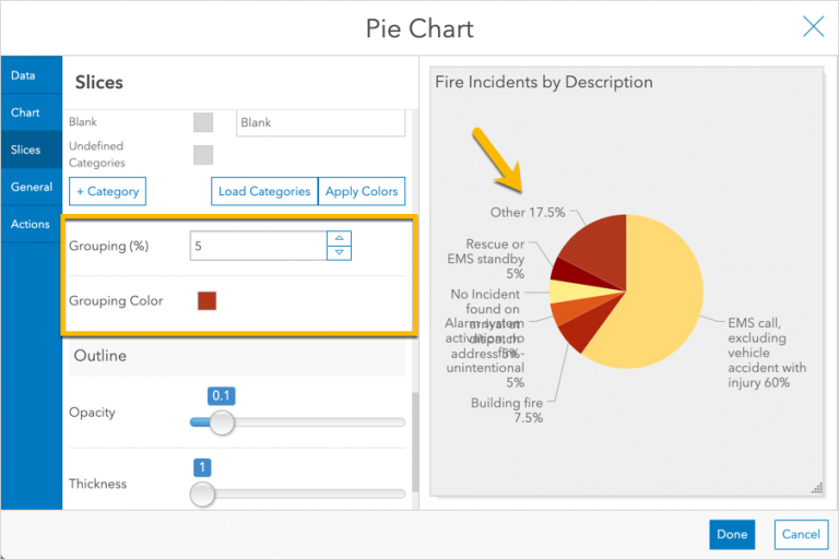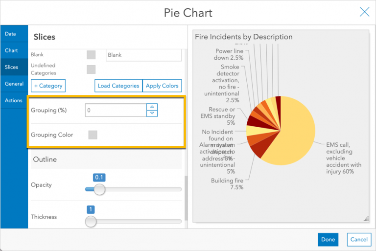 Next, consider whether your audience really needs to see all of the small slices. Perhaps the fire chief only needs to see the most frequent incident types. So, let’s group the small slices together. This can be done in the Slices tab with the Grouping % property.