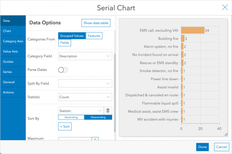 Let’s circle back to our fire incident dashboard. We want to display the breakdown of incident types for the chief, particularly the most frequently occurring types. Displaying this in a serial chart we can get the following: