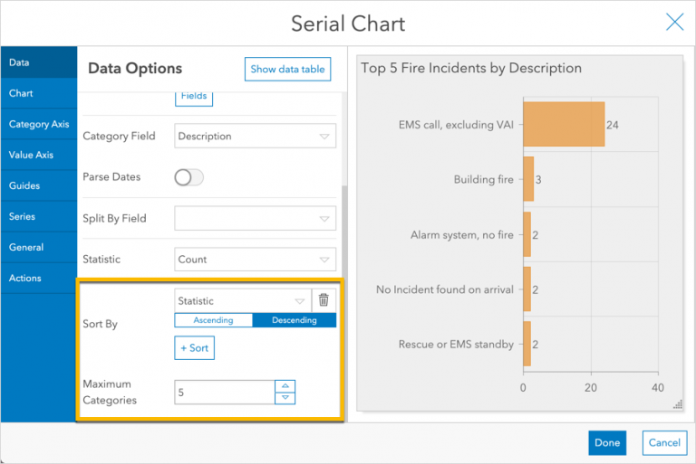 To simplify the chart further, we can limit it to the first “n” categories to show only the most frequent incident types. Apply a Maximum Categories value of 5 to only show the first 5.