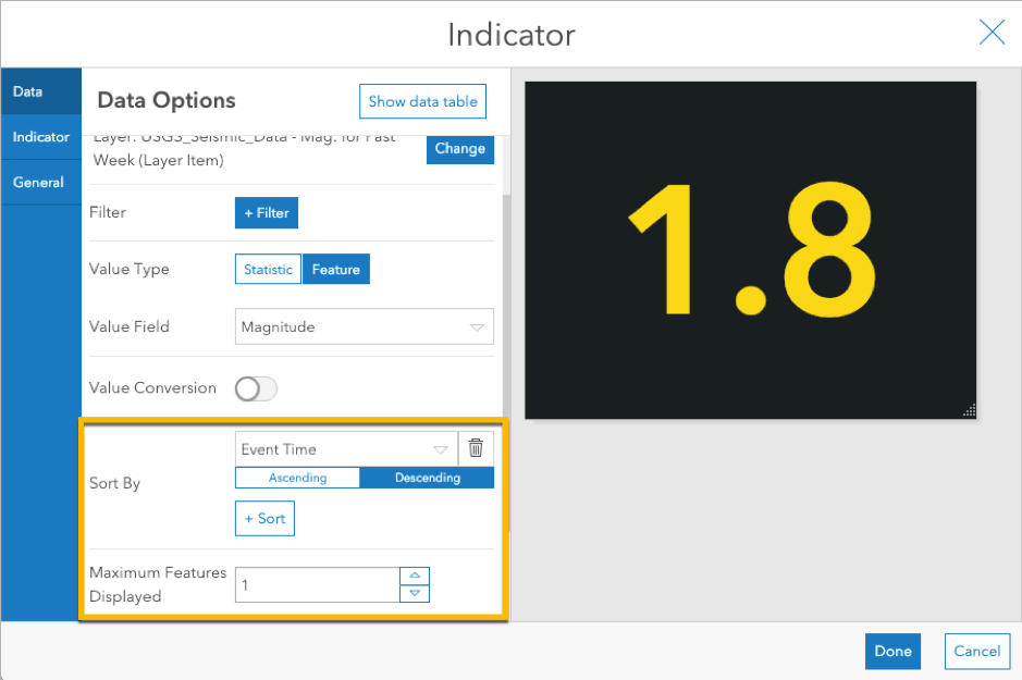 By default it displays the attributes of up to 50 features. By using the arrows at the top, a user can page through to see each feature. For the earthquake dashboard, let’s show the latest earthquake event (one feature). Apply a sort order based on the event time in descending order. This ensures the latest event will appear first (i.e., on top). Change Maximum Features Displayed to 1, as only the latest event is relevant for this dashboard.