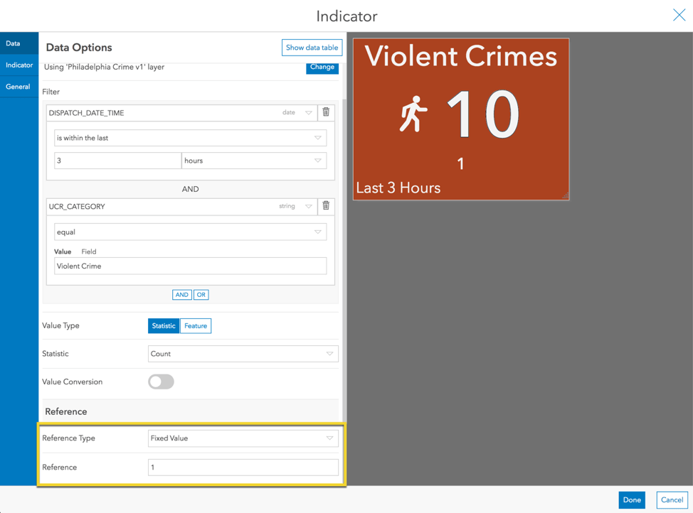 For the reference type, choose Fixed Value. Set the reference value equal to 1. We have, in a sense, defined a threshold of one violent crime. Next we’ll see what we can do with this “threshold”.