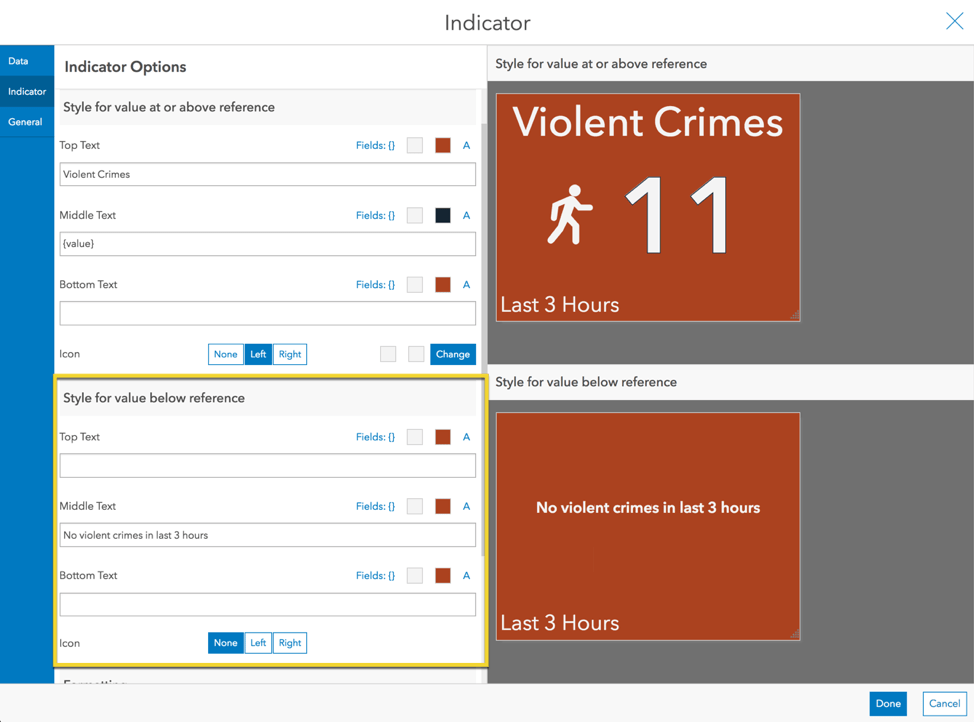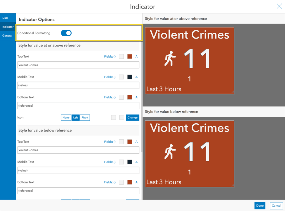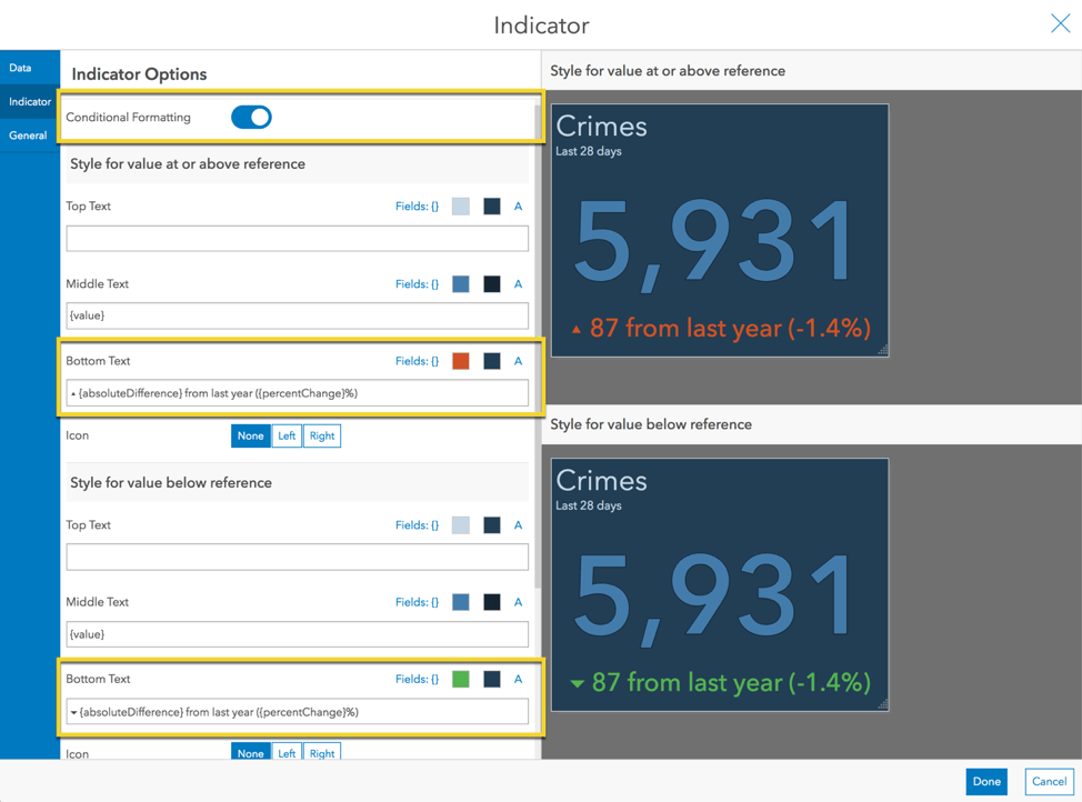 To further enhance the indicator, turn on conditional formatting. A preview is shown for each condition: 1) when the crime has increased/remained the same and 2) when the crime has decreased.