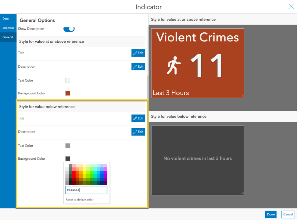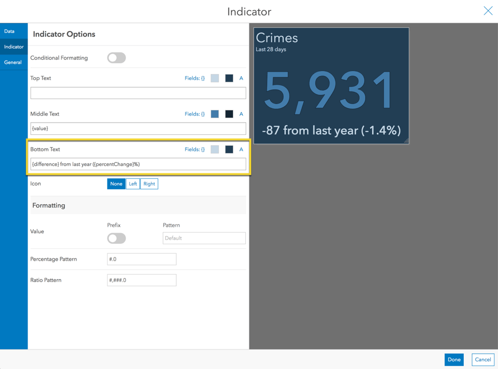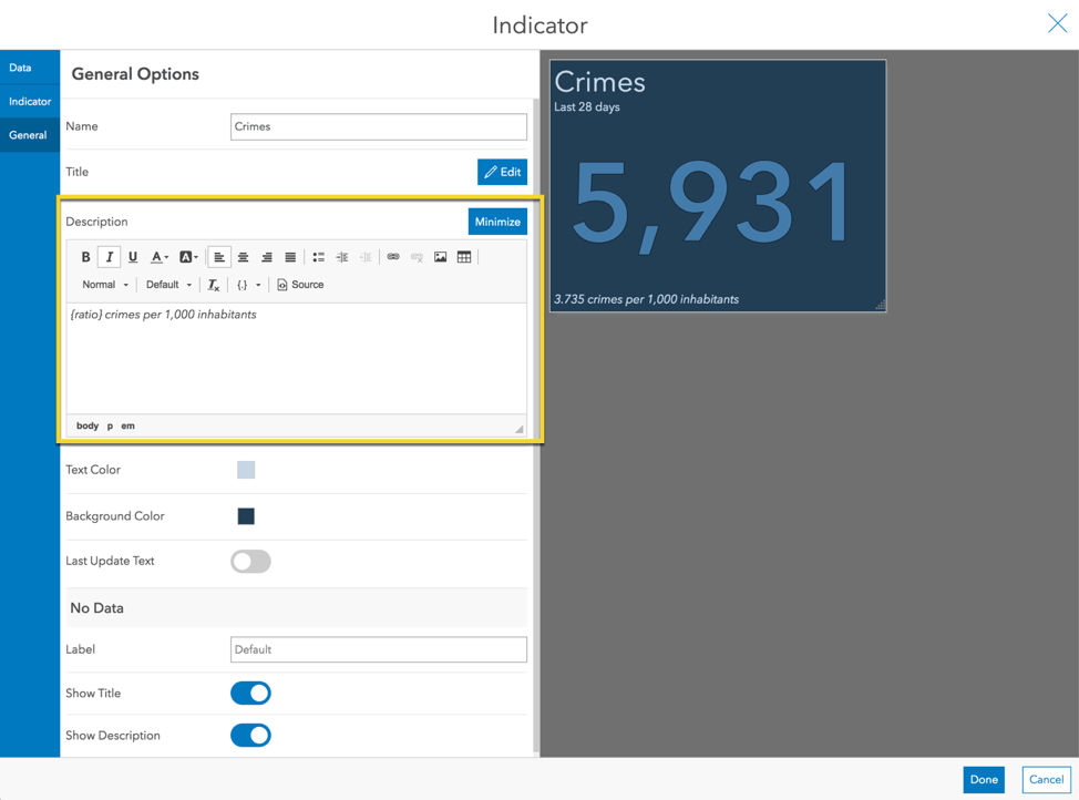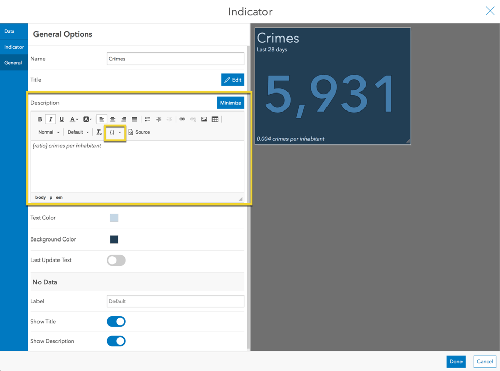 In the Indicator tab, erase the Bottom Text that was added. This time we will add our text in the element’s Description. In the General tab, edit the Description and inject the ratio of the crime count (value) to the population (reference).