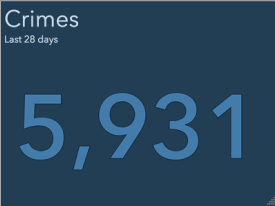 The indicator shows the 28-day crime count. The indicator would be more effective if we provided context to this number. Crimes fluctuate by time of year, and so it can be helpful to compare it to the same timespan last year.
