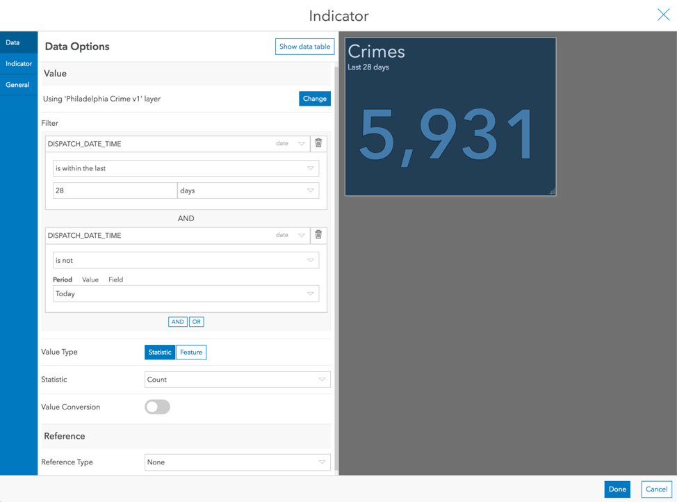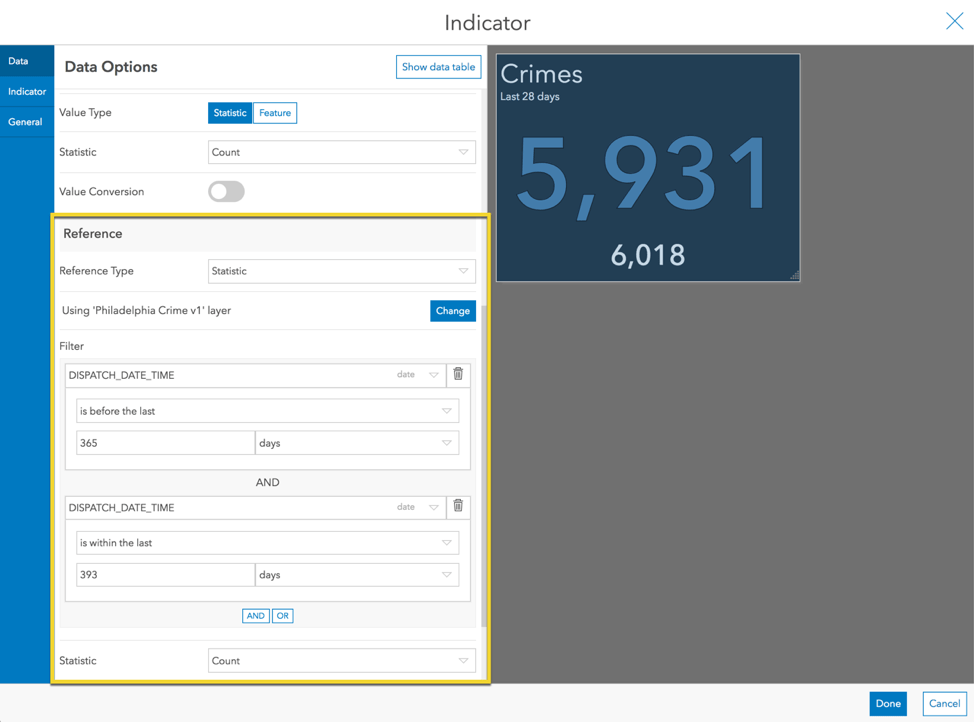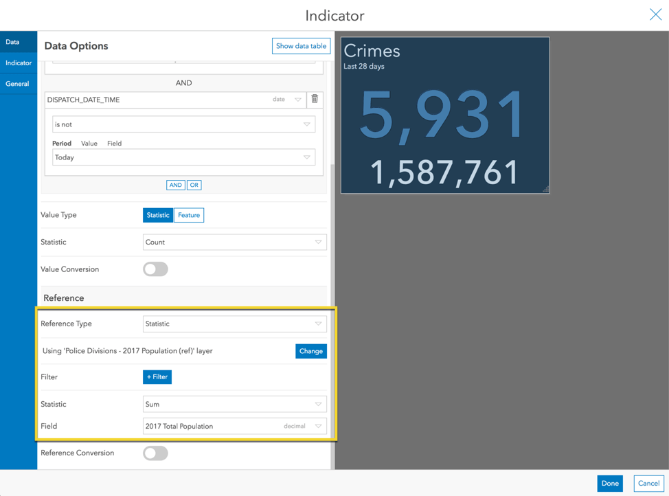 In addition to the 28-day crime counts, the police chief might also want to see crime “rate” (crimes per 1,000 inhabitants). Let’s enhance our indicator to include the rate. This time we will create a statistic-based reference that is based on a different layer—one with population data.