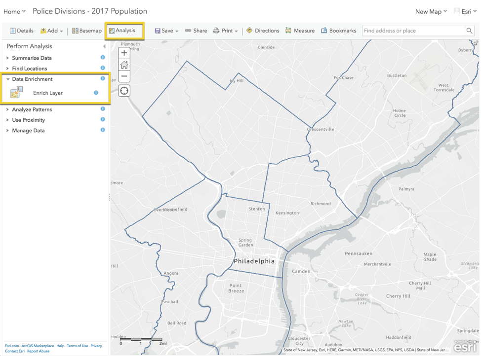 As part of the data set, we have a polygon layer of the police divisions. If we knew the population for each police division, we could sum them to get the total for the city (or even do a break-down per division). We can do this with ArcGIS Online by enriching layers.