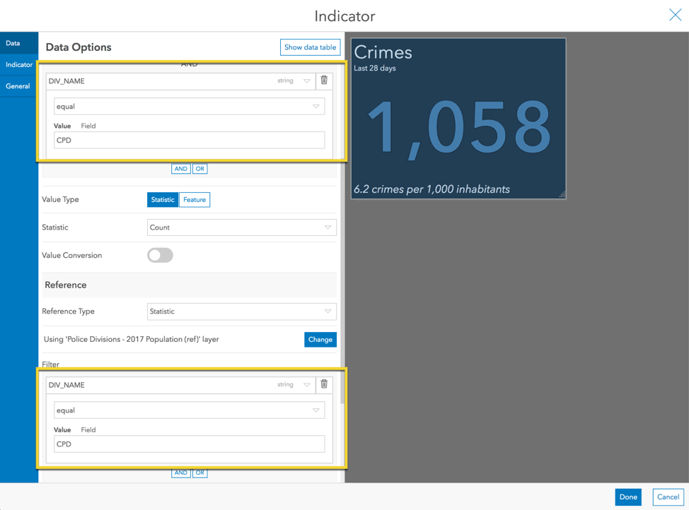 Before we wrap up, let’s go one step further. Since the crime rate likely varies across police divisions, we can create an indicator for each division. Apply a filter to limit the crime layer (the indicator value) to only the one division, such as the central police division (CPD). Also apply a filter to the police division polygon layer (the indicator reference) to limit it to the same police division.