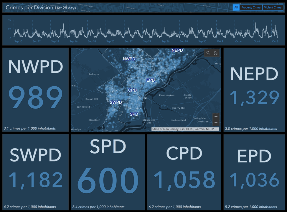 Now we have a geographic-specific crime rate. After pressing Done, we can duplicate the indicator and change the filter for each one to include a different division. With a bit more sprucing up, we can end up with the following dashboard. With it, the chief can easily identify the central police division as having the highest crime rate and compare it to other divisions.