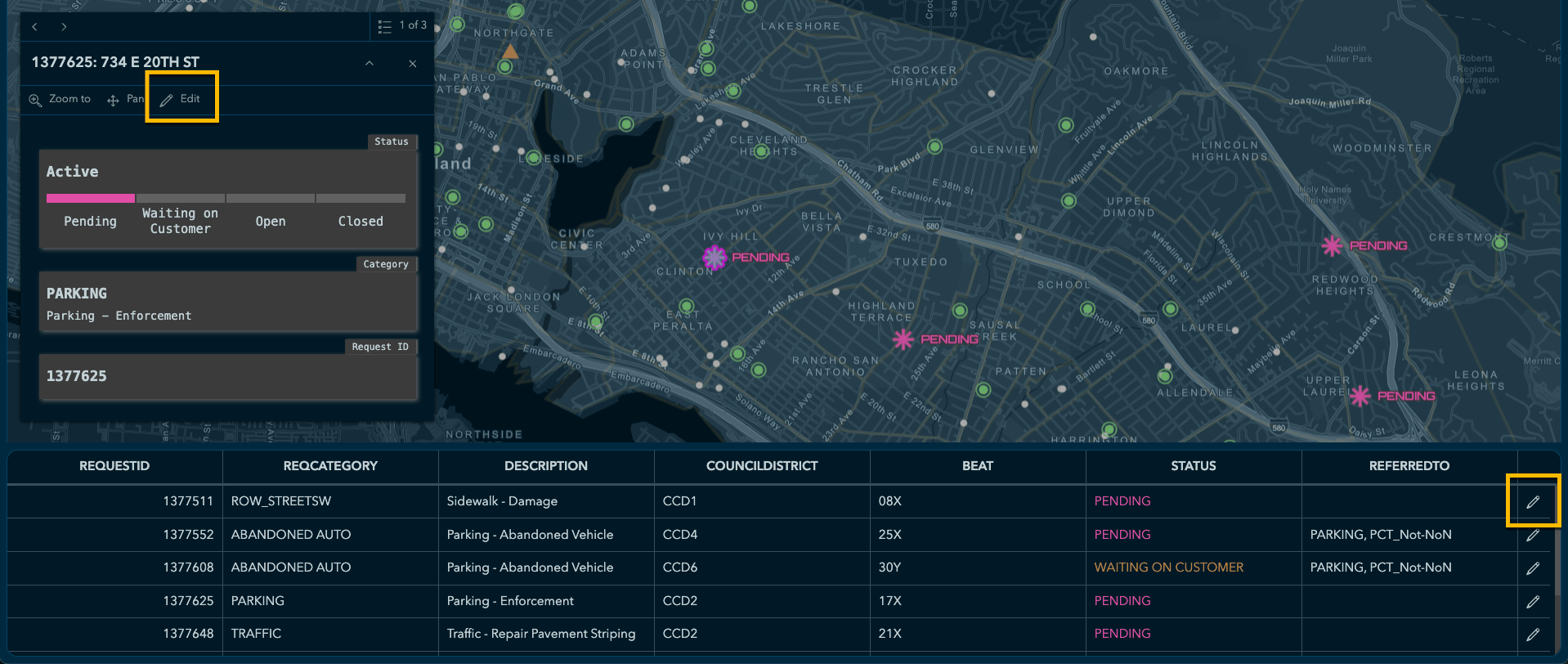 Edit buttons will appear on the table and map pop-ups, respectively.