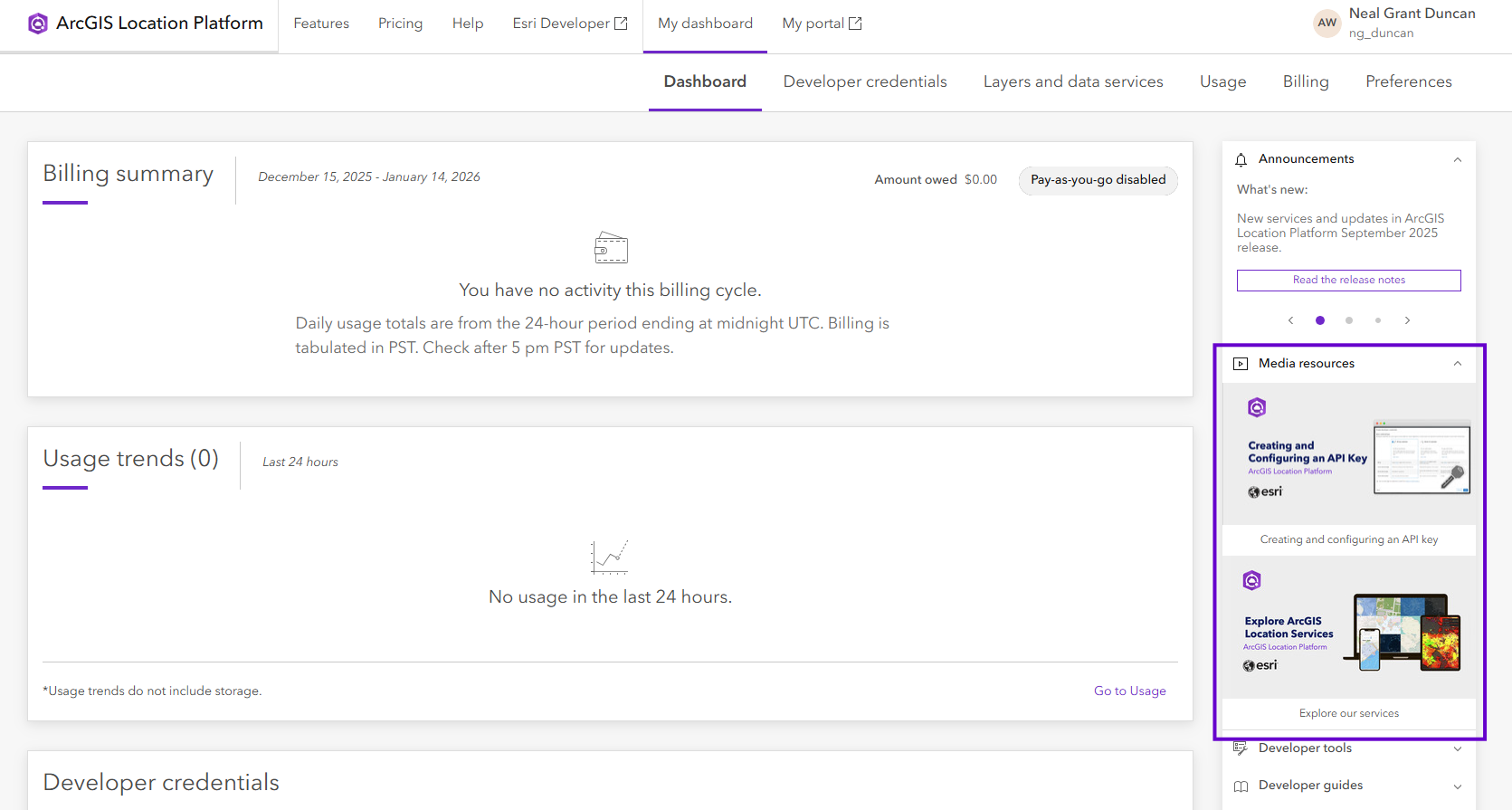 With technology advancing rapidly, developers need efficient systems that will help them maintain uninterrupted service and enable them to focus on innovation. ArcGIS Location Platform has recently received two updates: a revamped Billing page with enhanced features and a refreshed Dashboard page featuring new onboarding videos. The new Billing page now includes four intuitive tabs (Summary, Payment methods, Transaction history, and Pay-as-you-go), while the Dashboard page has been enriched with video content designed to help users get started with confidence.