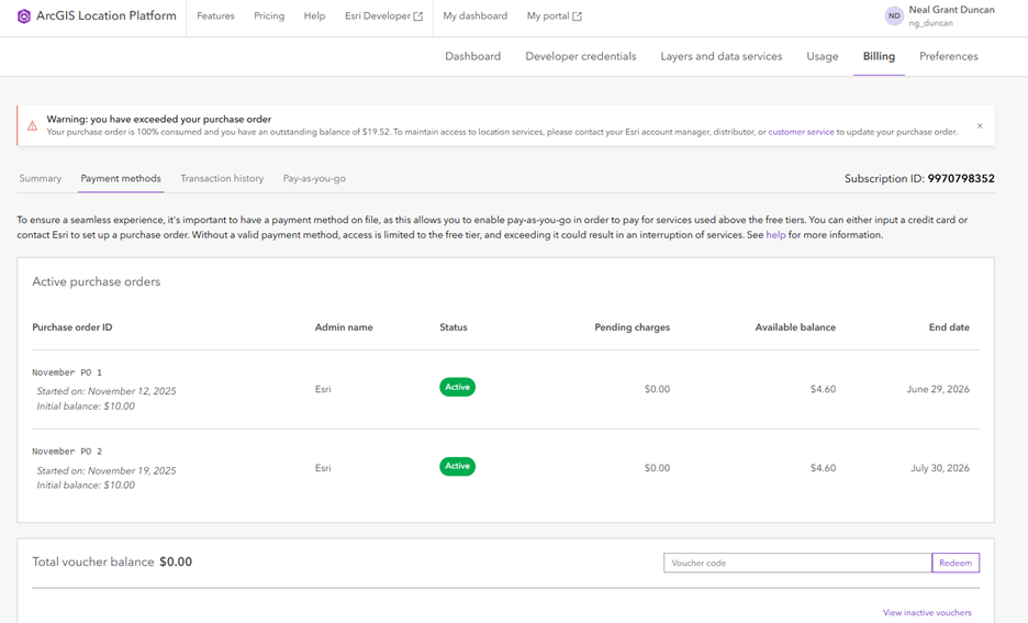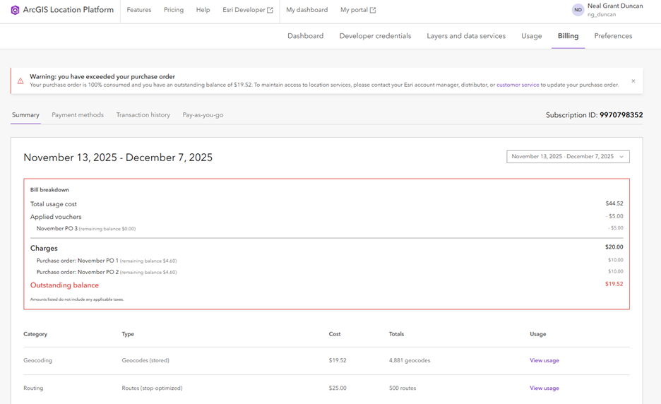 The new Billing page for ArcGIS Location Platform is a step forward in enhancing user experience by providing a more transparent and intuitive billing process. With features like detailed billing history, enhanced payment method visibility, and the ability to apply multiple purchase orders, users can now manage their accounts with greater ease, efficiency, and confidence.