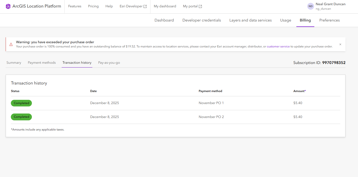 The ‘Transaction history’ tab has not received any changes and continues to display past transactions for users awareness. The ‘Pay-as-you-go’ tab is new to ArcGIS Location Platform and provides helpful organization to the Billing page.