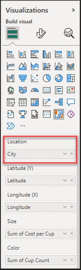 In some instances, you can filter data using all the available field wells in a Power BI visualization. In ArcGIS for Power BI, it is recommended that you use only one field well (or two if you are using the latitude and longitude field wells) to display your data. Having a combination of both the location and XY field wells will result in a map that does not meet requirements.