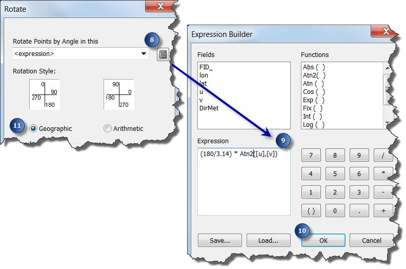 To correctly display wind or current direction in ArcMap, the U and V components must be converted to a symbol rotation angle. The steps below assume that you have a point feature class with the attribute fields u and v. To calculate the rotation, follow the steps below:
