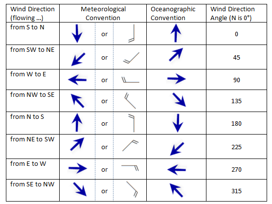 Storing information about the flow of wind or water as vectors provides flexibility in how we calculate direction. This is important because meteorologists and oceanographers describe the flow of wind differently. Oceanographers prefer to describe wind in terms of the “direction of mass flow” or in other words the direction towards which the wind is blowing. In the oceanographic convention, wind flowing from the south to the north is symbolized by an arrow pointing north. Meteorologists use an arrow or a special symbol called a wind barb to show the direction from which the wind is blowing. The head of the arrow or wind barb points in the direction from which the wind is blowing. In the meteorological convention, a wind blowing from west to east is symbolized by an arrow pointing west. Water currents are almost always symbolized using the oceanographic convention.
