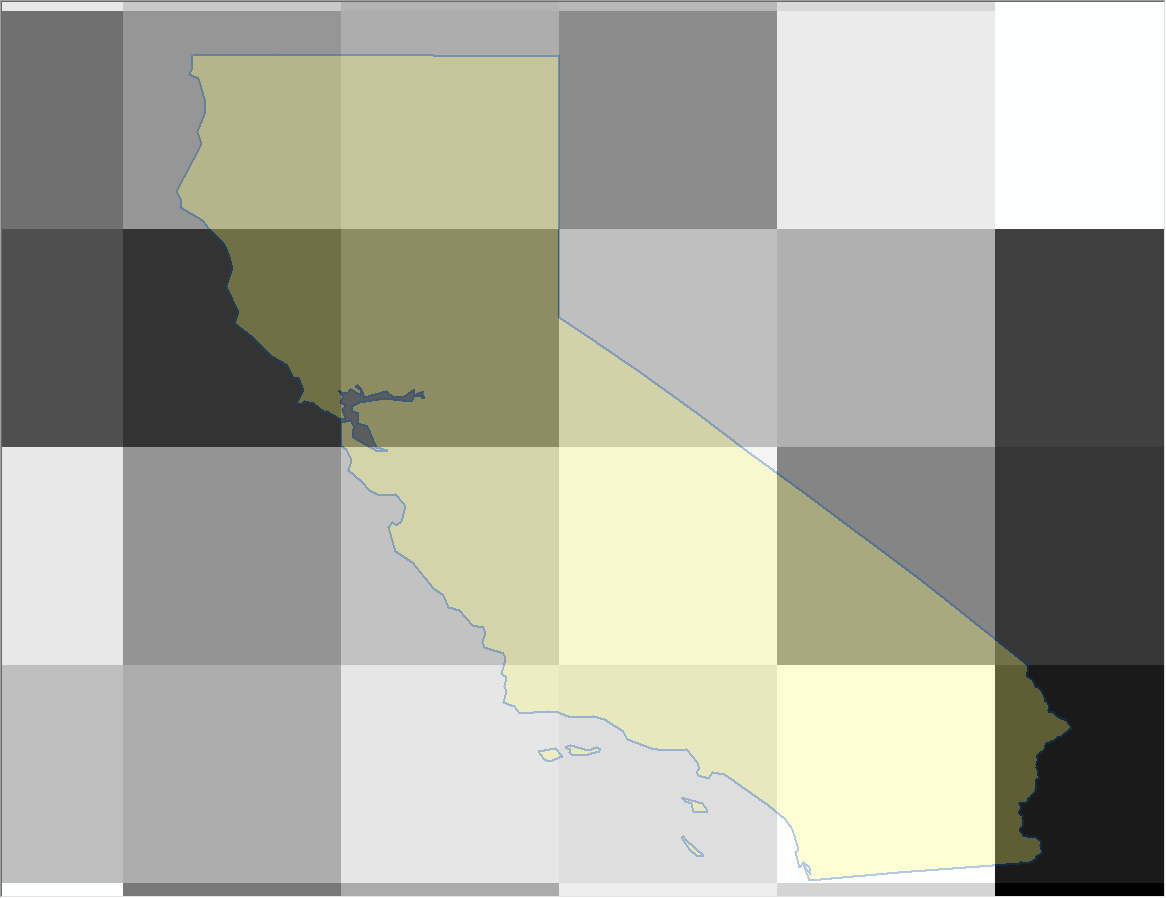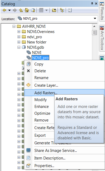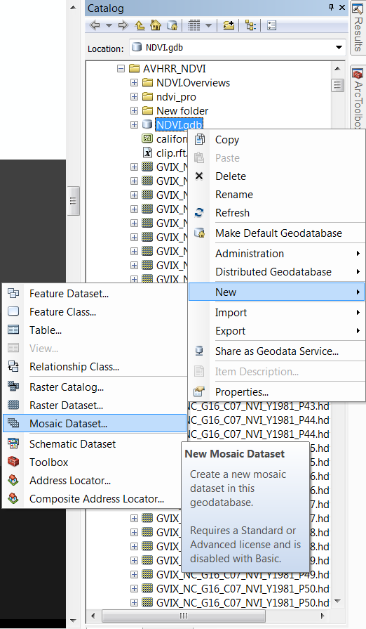 This image will give you a sense for how big these pixels are relative to the state of California. The first thing to do is to throw everything into a mosaic dataset. From Catalog, right click on a geodatabase, and create a new Mosaic Dataset. Once complete, right click on the mosaic and add rasters. Create separate mosaic datasets for precipitation and NDVI.