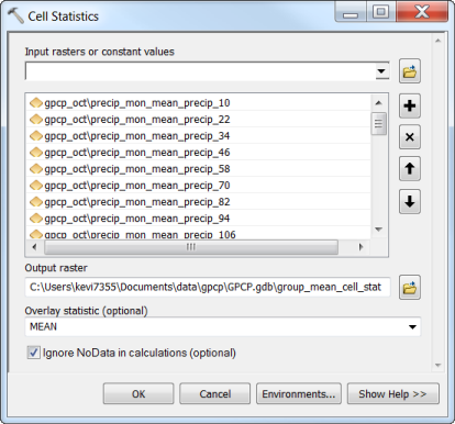 I talk about functions a lot in these blogs, but let’s not forget about the geoprocessing tools when working with imagery. There’s one in particular, Cell Statistics, which can be used in time series analysis. I’m going to use this tool to calculate the average precipitation and NDVI for all of the Octobers in each time series. Then, I’m going to use functions to subtract the average October from the October 2013 data for precipitation and NDVI and we’ll be able to see how this past October differs from an average October.
