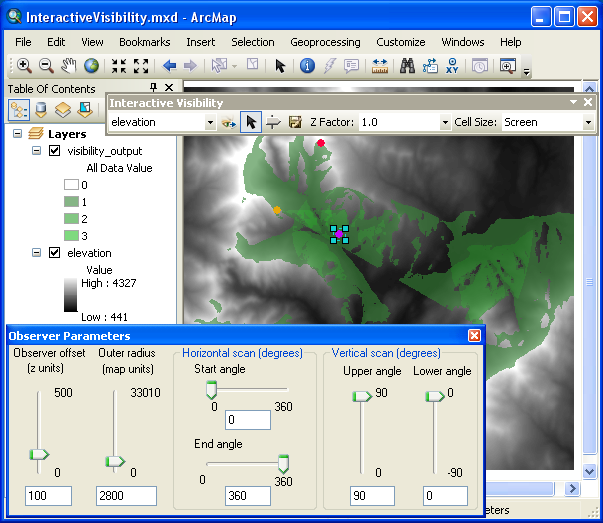 With Spatial Analyst you can perform visibility analysis, but you may have found that altering the parameters of the operation can be a little tedious. Well, we have a new solution for you! Available for download is a new Interactive Visibility add-in toolbar.