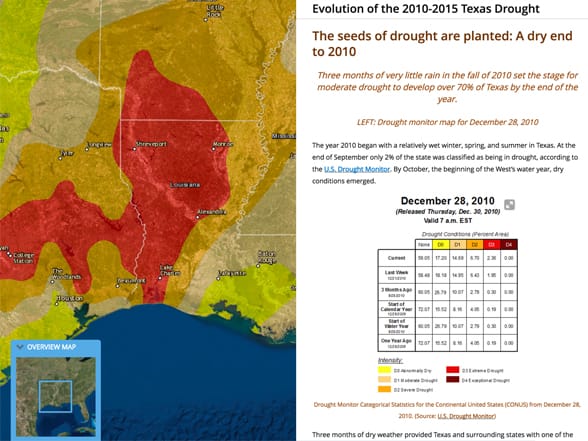 Using data compiled by the National Drought Mitigation Center from numerous agencies, this map focuses on the widely varying degrees of drought in Texas from 2011 to 2016.