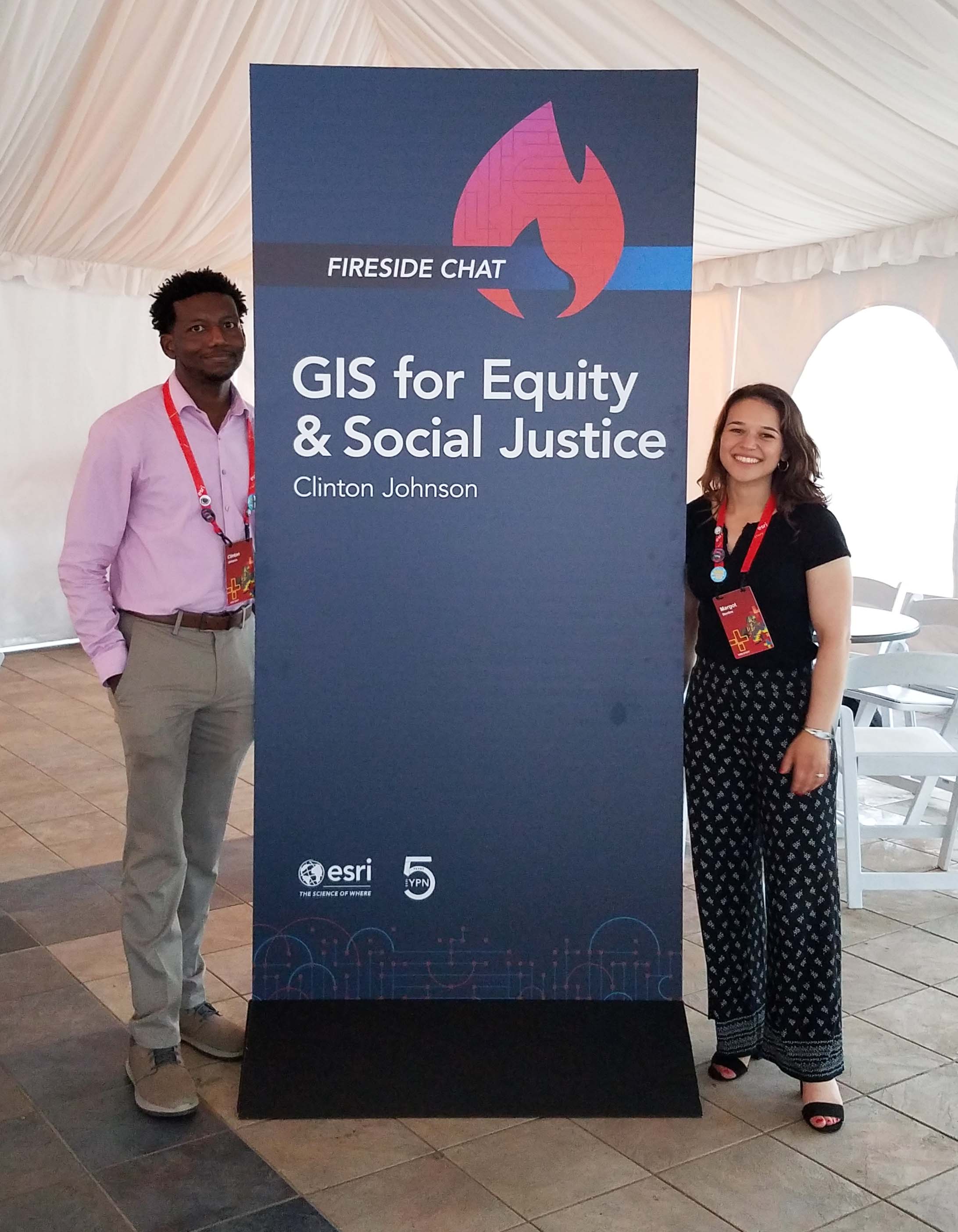 Throughout the conference, there were many opportunities to socialize and connect with likeminded individuals. A networking event to note was the YPN Welcome Social on Sunday, where several Esri employees hosted informal “fireside chats” on various topics. Margot Bordne, leader of Esri’s WeCan hosted a “Women in Tech” fireside chat, while Clinton Johnson, leader of Esri’s Employee Resource Group focused on people of African descent (NorthStar) hosted the inaugural “GIS for Equity & Social Justice” fireside chat. These informal gatherings, hosted side by side, brought together likeminded people from different backgrounds to exchange ideas on how to improve diversity & inclusion in the GIS industry and advance equity & social justice in the world using GIS technology.