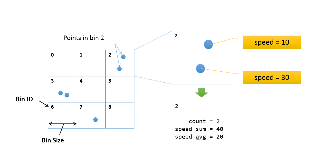 The Big Data team is excited to offer a new tutorial on spatial aggregation (sometimes called spatial binning). Spatial aggregation is extremely useful in summarizing big data to gain a meaningful snapshot of patterns in your data. Spatial aggregation works by creating square bins of a user specified size, like this:
