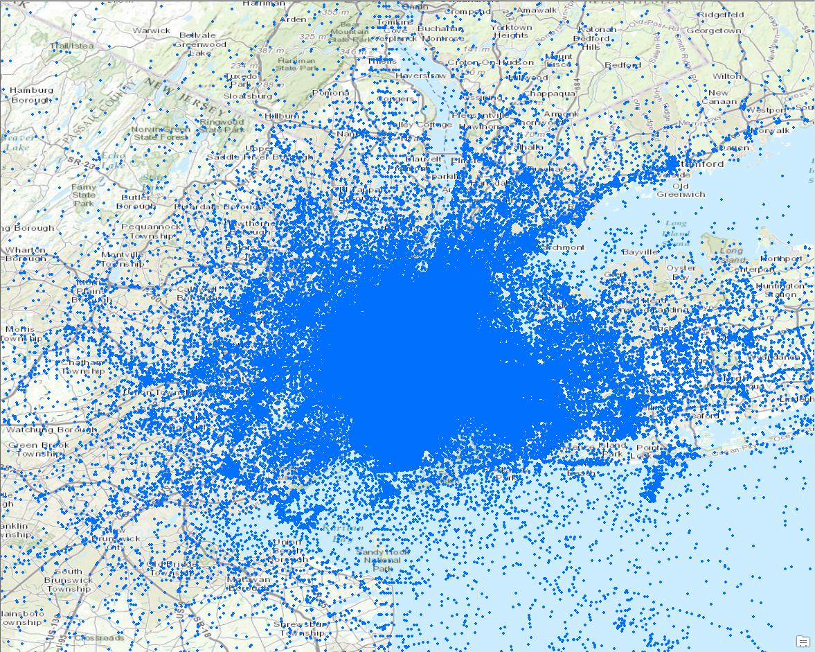 It’s pretty hard to gain any information from this map. You can kind of see that most points are close to NYC, but that’s about it. This dataset is actually NYC taxi data that is freely available online. While it’s a very interesting dataset, it can be hard to deal with such mass quantities of data.