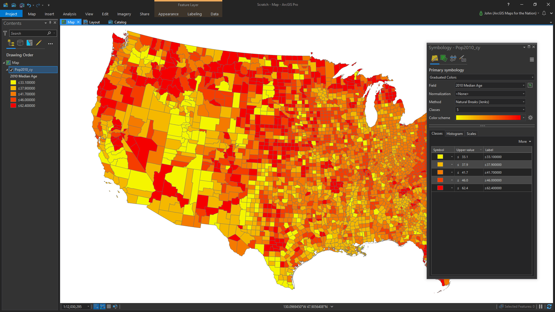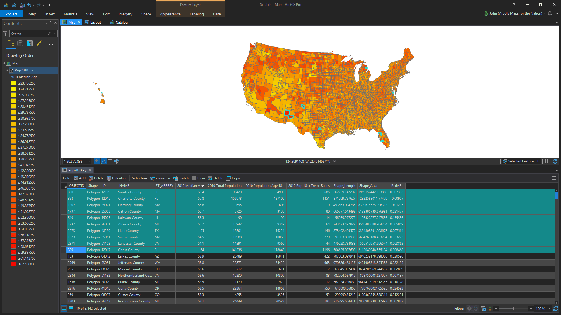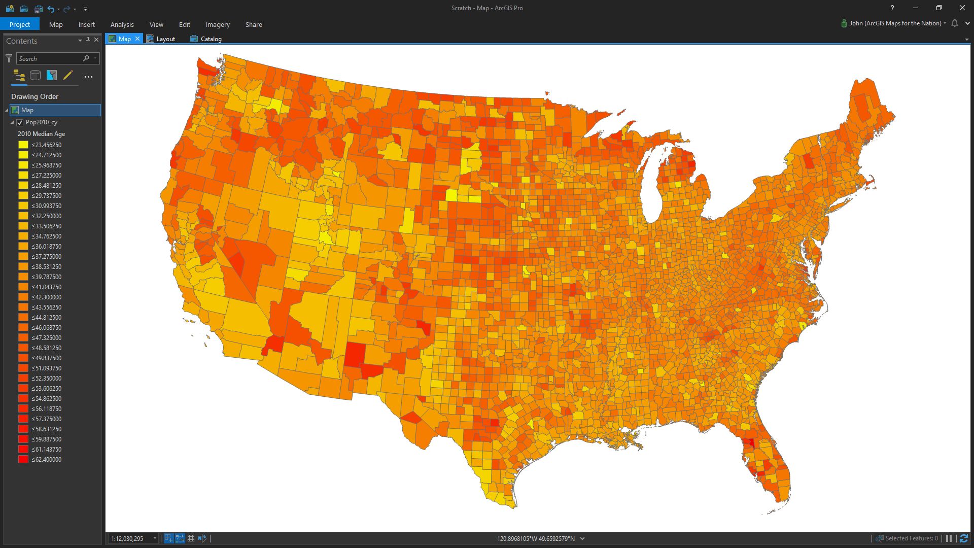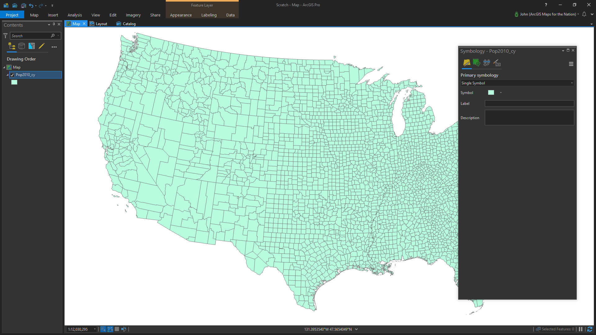 I opened ArcGIS Pro (could just as easily have been ArcGIS Online) and added in a layer of US counties with census data.