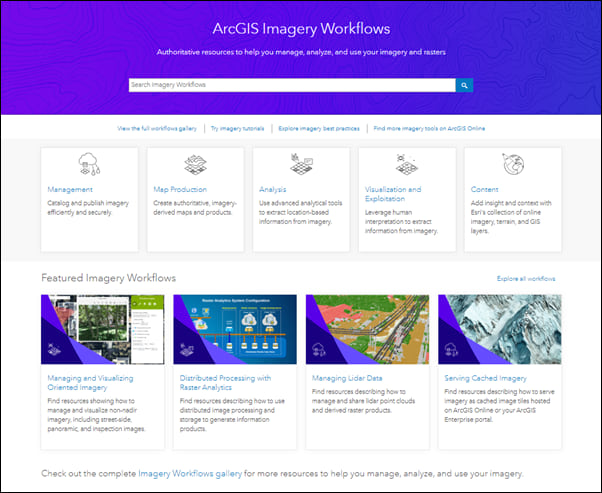 We’ve got a gallery of imagery workflows organized around the five imagery capabilities of the ArcGIS platform: