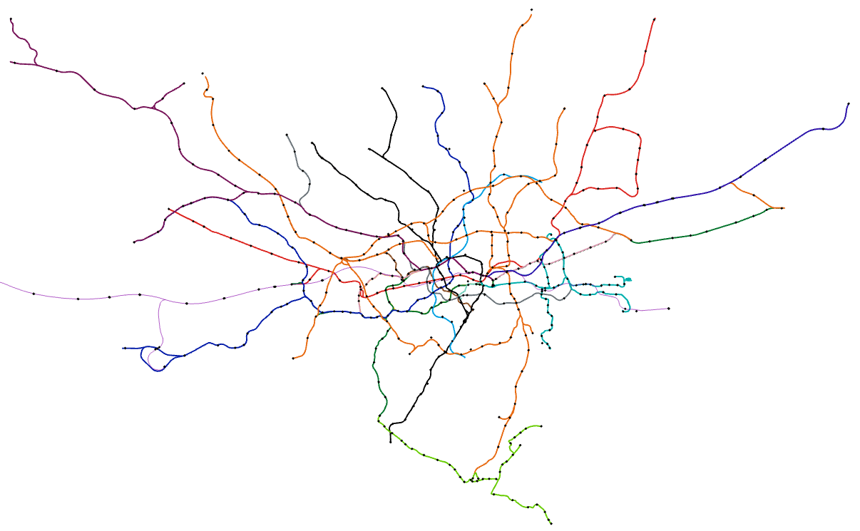 Well let’s take a quick tour of some of the tricks to making a transit map. I’m going to make a new map of London’s transit network as an example. But what does it look like geographically and why don’t we just use that map?