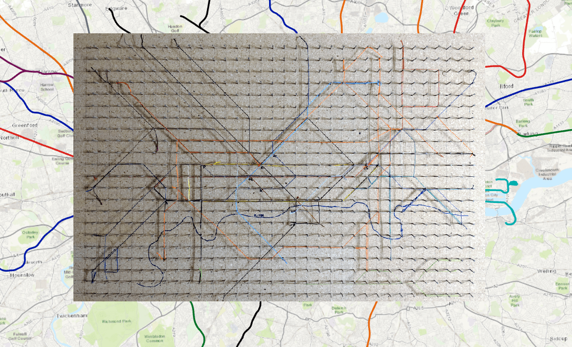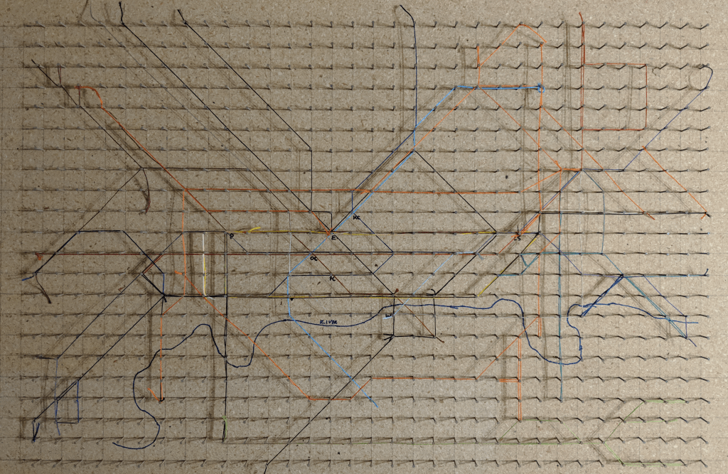 For my example I went a stage further but this is by no means necessary. I made a physical peg board which had 800 nails in a square grid each 3cm apart. Beck’s original map was laid out on a square grid and while I’ve experimented with other forms I keep coming back to squares which seem to suit the layout of London. Here’s the board with a load of thread that I used to lay out the map. The beauty of sketching (whether using pencil, thread, or some other physical means) is that you’re engaging in a manual creative process using your hands to craft something before committing it to a different medium, and you can easily change things around quickly. You can, of course, skip straight to digital if you prefer.