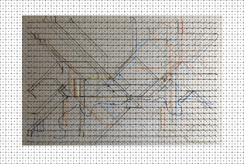 Most transit maps use a grid as a framework. This grid supports the systematic creation of the lines in an orderly fashion. A grid can use pretty much any geometric shapes that tesselate such as squares, hexagons and triangles. This provides you with the scaffolding for the map.