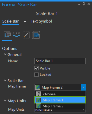 Tip: If your scale bar says something like 2,000 kilometers, it’s referring to the key map instead of the main map. You can fix this problem in the Element pane by changing the Map frame to Map Frame 1.