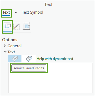 On the ribbon, click the Insert tab and click Dynamic Text. Scroll down in the menu and choose Service Layer Credits.