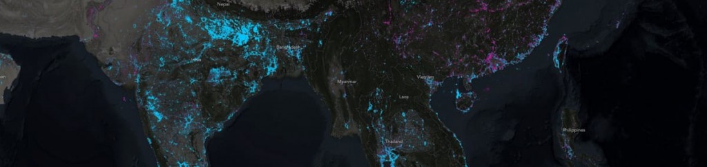 This story map looks at where night lights have turned on (blue) or dropped out (magenta) globally. Southeast Asia and the Indian subcontinent are shown here.
