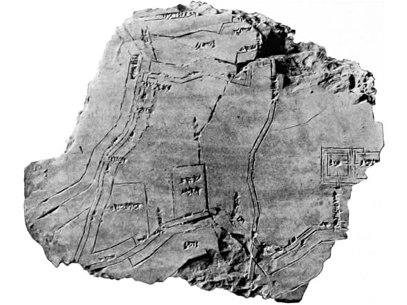 This 2,500-year-old Babylonian clay map shows a plot of land in a river valley between two hills. Inscriptions record the owner of the 12-hectare parcel as a person named Azala.