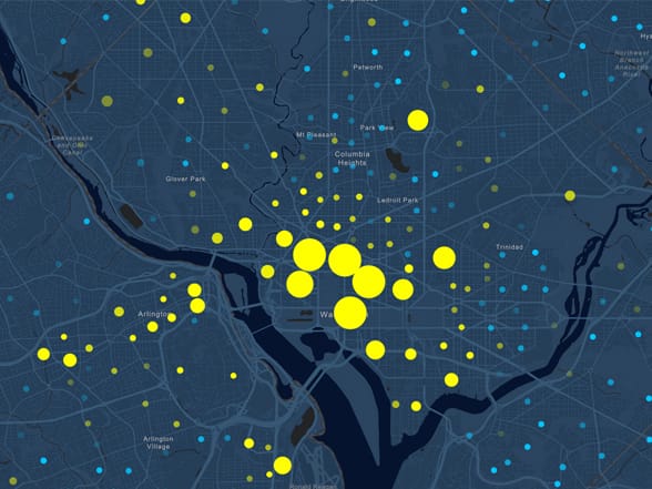 This map of daytime population patterns is effective because (A) it simply conveys several related datasets (predominance of workforce versus home daytime population), (B) it is multiscale with total US coverage, (C) it is interactive and can be “clicked through” to uncover more detailed information, and (D) it makes effective use of bright spot colors displayed on a muted but still readable basemap.