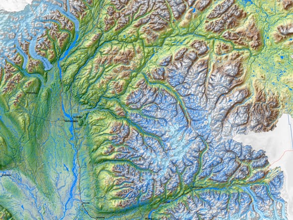 The Matanuska-Susitna Basin has a complex geography and dense hydrologic network of streams, rivers, and lakes. This map works by employing important techniques to present a striking view of the entire area.