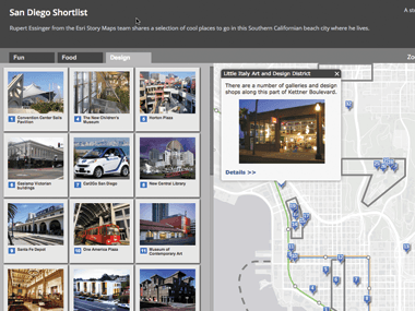 Anyone can make, share, and use web maps. You can start by going through a short example. Suppose you want to make a map that allows you to explore the food, architecture, and design destinations for San Diego.