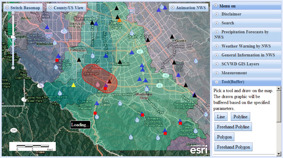 The Santa Clara Valley Water District Alert web map was designed using the ESRI javascript API. Santa Clara Valley Water District provides real time rainfall, stream flow/stage and reservoir storage/elevation data for Santa Clara County. The Alert web map uses overlay techniques to deliver National Weather Service (NWS) forecasted rainfall up to 72hrs and NWS issued weather warnings for the county. NWS radar animation lasts up to 3 hours and provides the latest rainfall information. Residents in the county can use the Alert map to get real time and advanced flood related information.