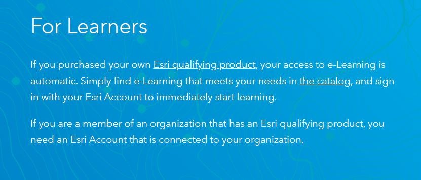If you are an Esri customer with current maintenance for an Esri Qualifying Product you have access to e-Learning: unlimited, organization-wide access to our large collection of self-paced e-learning resources. This is a perfect option for those of you that prefer learning at your own pace.