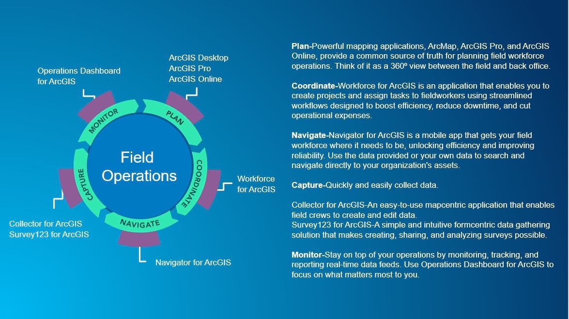 Meter Change Outs: Rural Lorain County Water Authority used four products shown in the diagram to transform its field data collection for meter change outs: Arc Map, ArcGIS Online, Collector for ArcGIS, and Operations Dashboard for ArcGIS. This enabled it to collect, visualize, and share information using web maps and dashboards, saving hours of manual data entry.