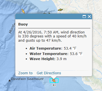 Wind Probability was added to Active Hurricanes. This update adds data showing wind speed probabilities for tropical storm force (34 knots), strong tropical storm force (50 knots), and hurricane force winds (64 knots plus). Observations from buoys have been added to the Current Wind and Weather conditions layer. This adds additional observations from the network of buoys via NOAA’s National Data Buoy Center.